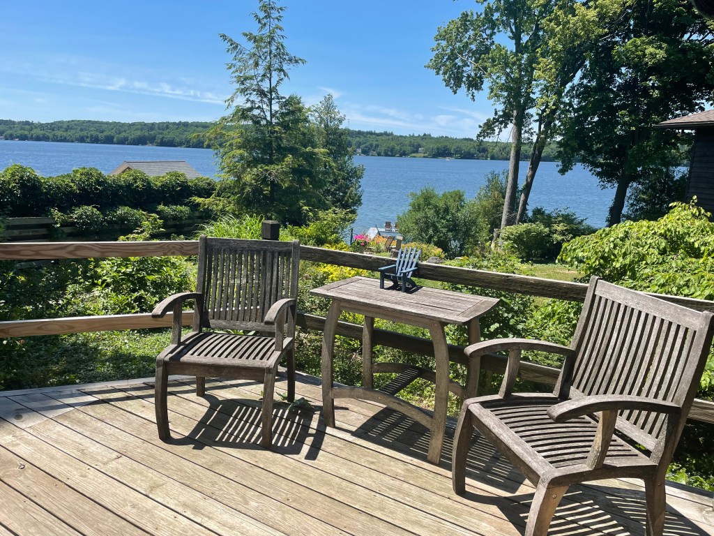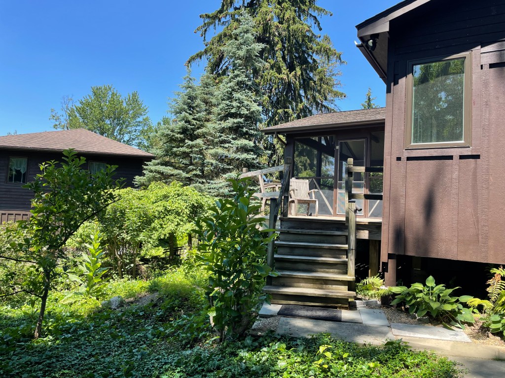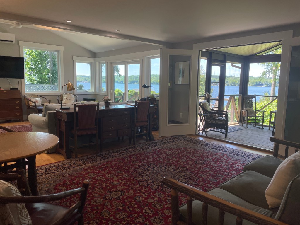 Enclosed porch overlooks gardens and private dock.